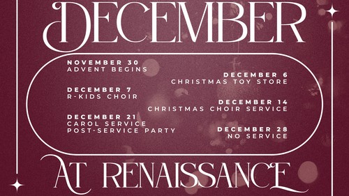 DECEMBER AT RENAISSANCE Join us for the month of December as we celebrate the birth of our Savior. Each week leading up to Christmas, we will observe Advent through prayers and reflections anticipating the arrival of Jesus.